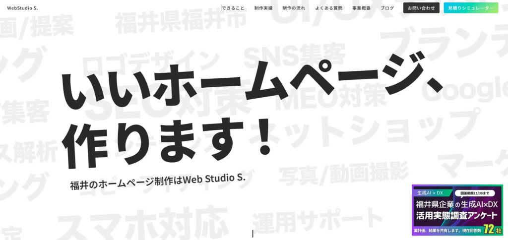 福井県鯖江市を拠点とするWeb Studio S.は、ホームページ制作からマーケティング支援までを幅広く手掛けるクリエイティブ事務所です。少数精鋭の体制を活かし、コストを最適化しながらも、高品質なWebサイトやECサイトの構築を実現しています。